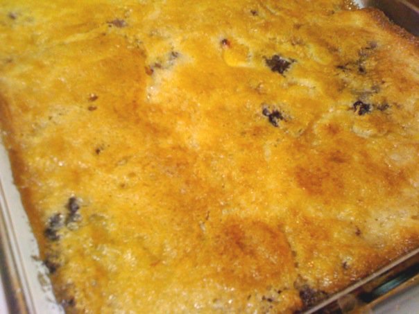Mix well. Pour over the melted butter in the casserole dish.  Do not stir.