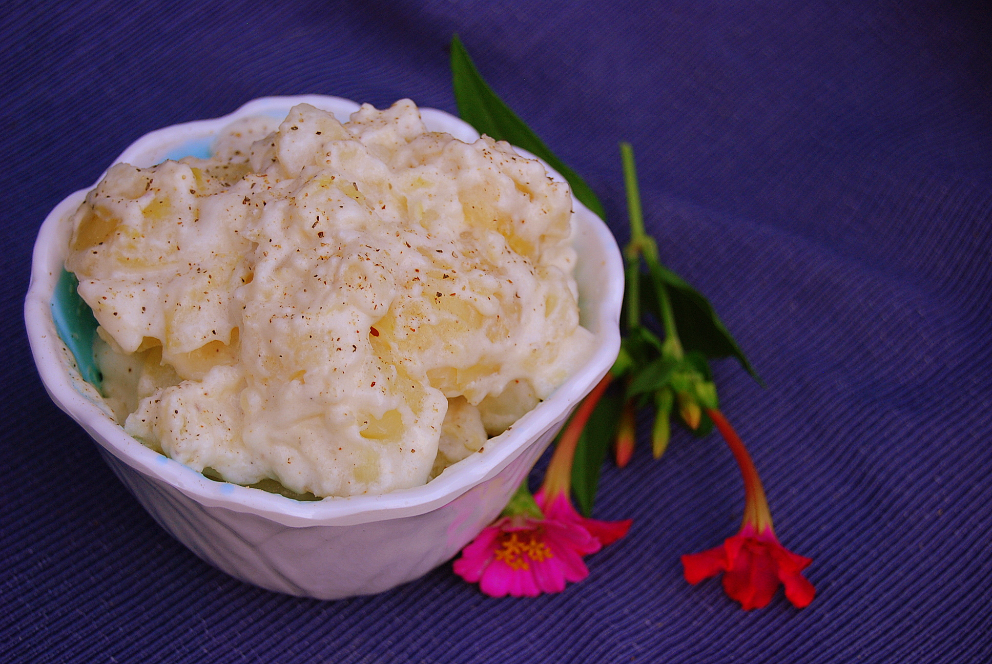 Scalloped potatoes, a zinnia, and four o'clocks.