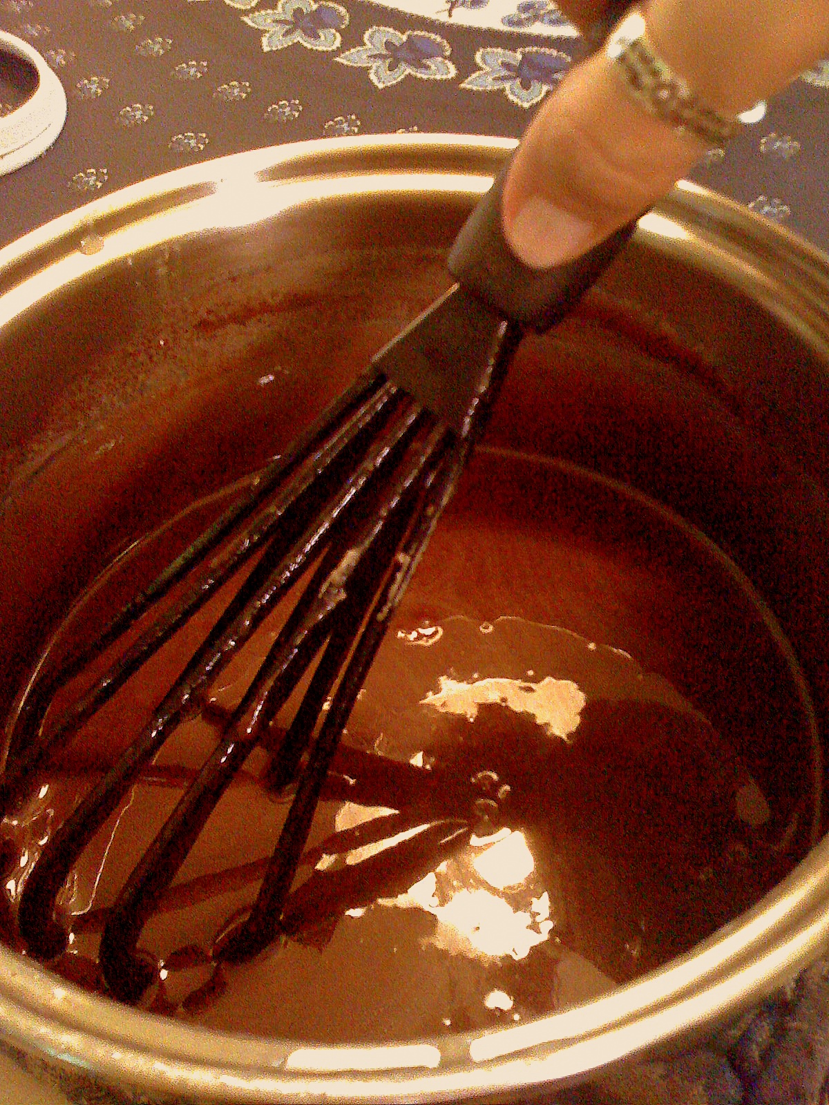 Remove from heat at this point, and whisk the chocolate mixture into the syrup mixture. Whisk together for about ten minutes. (You might want to sit down during this part. It’s a long time for some people to stand in one place and stir.)