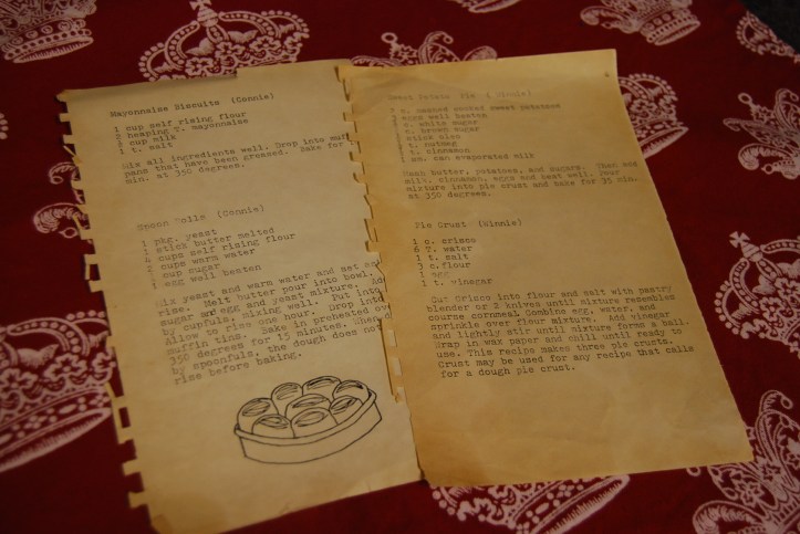 I have a cookbook like that; it’s fondly and simply called “The Frazier Family Cookbook.” The pages are yellowed and falling out of the book, but it is still wonderful to look through and try out what the women in the family cooked when my generation was still in diapers. Here are a couple of the pages that have fallen out. Winnie is my husband’s grandmother (she went by “Mammy”), who passed away in 1986, I believe. I never got to meet her. Connie was one of her daughters-in-law.