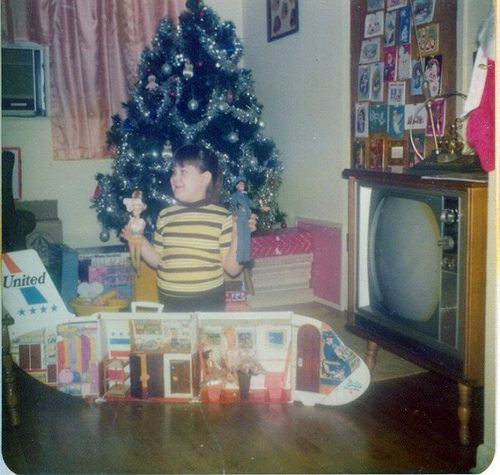 Another year I got the Barbie Airplane, and Barbie and I were stewardesses. This picture isn’t of me, but it’s probably the same Christmas morning! So cute! My Christmas tree was not unlike hers, either, with the silver tinsel. Remember tinsel? I hear it’s making a comeback. Did you have that on your tree?