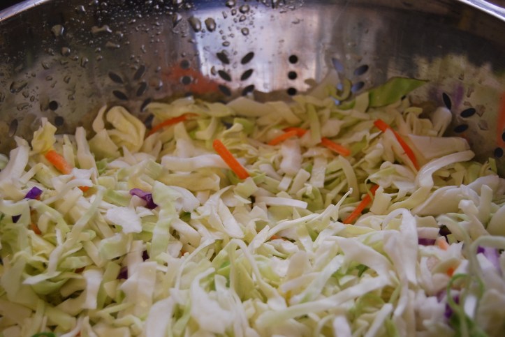 Rinse the shredded cabbage mixture (even though the bags always say “rinsed and ready to eat,” I always rinse anyway. I always taste a little something there that I’d rather rinse away) and drain in a colander.