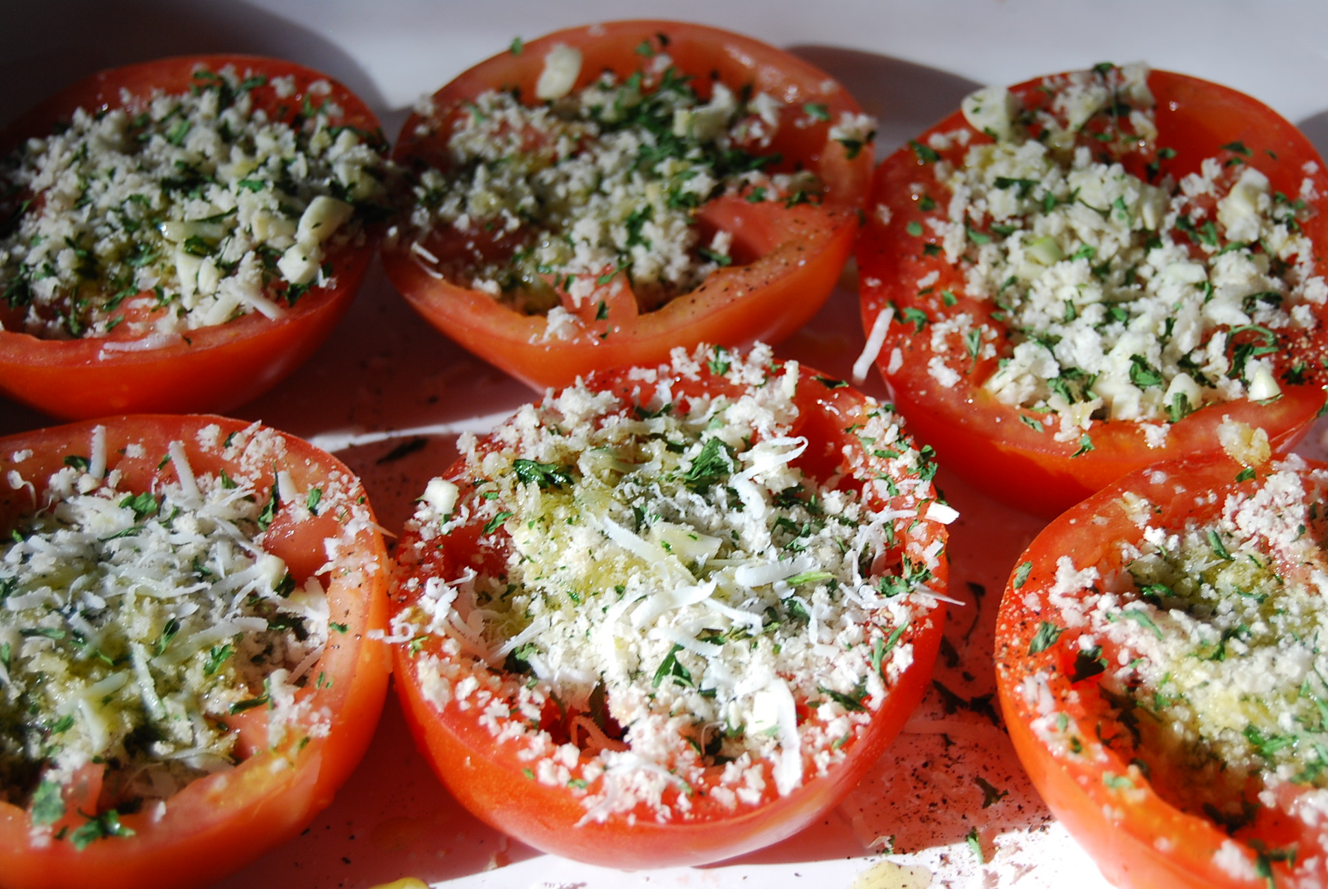 Preheat your oven to 375F. Lay out the tomatoes seed side up, in a large oven-proof baking dish. Scoop out some of the seeds to make more room for the breadcrumbs. Sprinkle with salt and pepper. In a small bowl, mix together the breadcrumbs, garlic and parsley. Using a small spoon, fill the tomatoes with the breadcrumbs mixture. Drizzle with some olive oil, top with parmesan, and bake for 30 minutes or until the tomatoes are softened and the breadcrumbs are golden brown. Serve immediately. Enjoy!