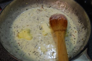 In the melted butter in skillet, saute the shallot until tender. Add garlic; cook one minute longer.  Add the wine, lemon juice, herbs, and lemon zest.  Cook over medium heat until liquid is reduced by about half.  Add cream; cook until thickened, stirring occasionally. (don’t let it scorch! Stay with it and stir.)