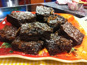 I love the idea of serving these brownies with ice cream; I especially like the idea of cinnamon ice cream, but vanilla will work wonderfully well, too. To make a sundae, it’d be a great idea to top the brownie with ice cream, then drizzle chocolate sauce or warmed dulce de leche over the ice cream; maybe sprinkle on some toasted pecans at the end! The very thought of that makes me think of one word: decadent! It also makes me grateful for a holiday that gives us a chance to indulge in rich treats like this every once in awhile. Enjoy!