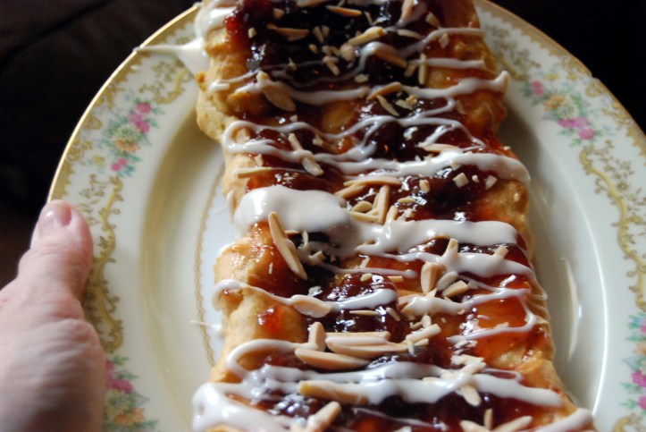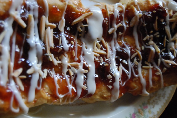 There is a recipe I’ve been meaning to try to out to share with you guys and I finally made time for it today.  It’s a recipe on the King Arthur Flour website. (I love King Arthur Unbleached Plain Flour. Its texture gives a nicer chewiness to my cookies, I’ve noticed, and I really prefer it to the bottom-of-the-line store brand flours that are out there. It’s more expensive, but it’s really superior.) They call this recipe “almond puff loaf,” but I used vanilla extract instead of almond extract, and strawberry preserves instead of their chosen apricot.  We prefer strawberries any day. 🙂