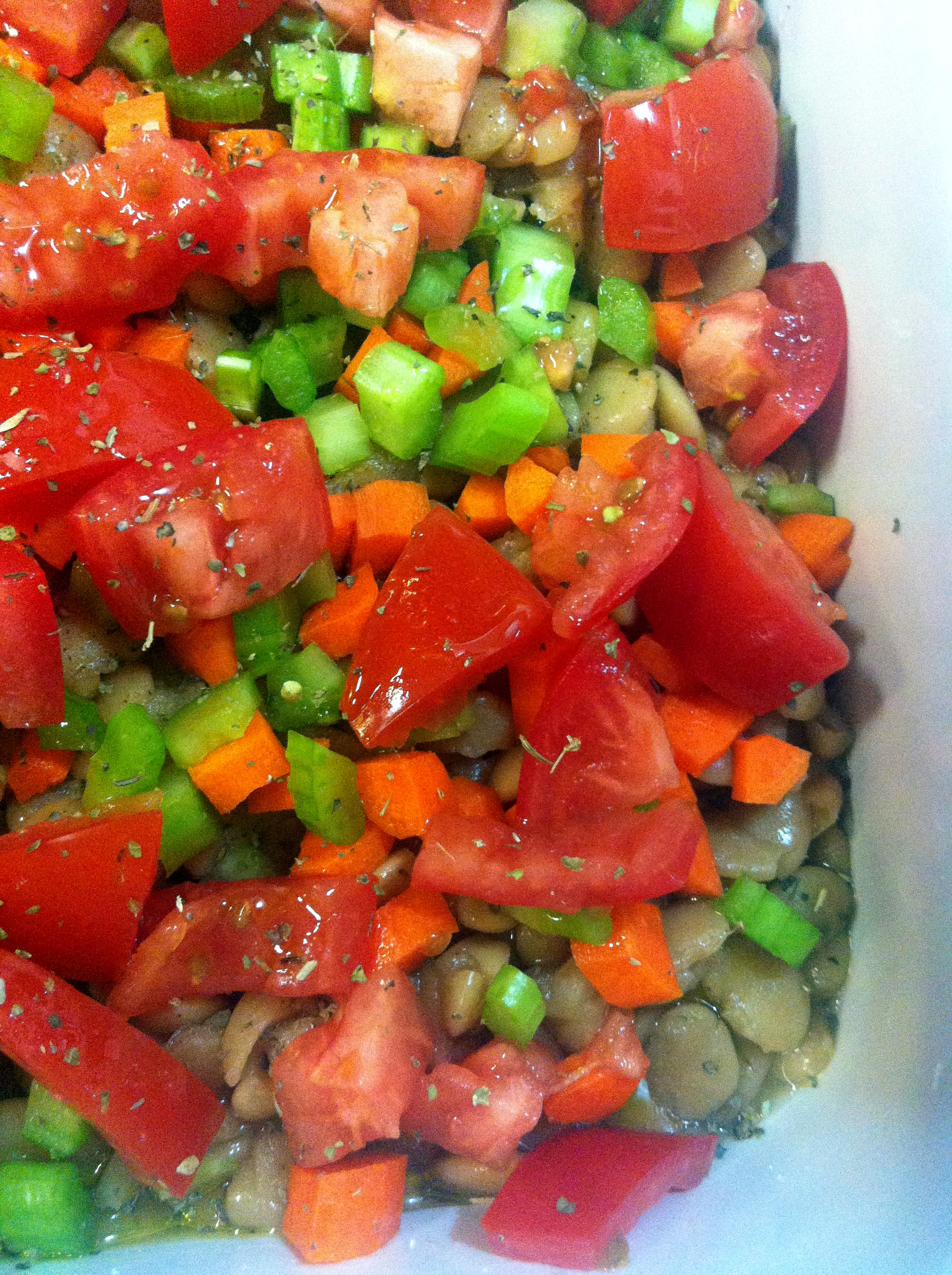 Spread chopped vegetables over the beans. Drizzle with the olive oil.