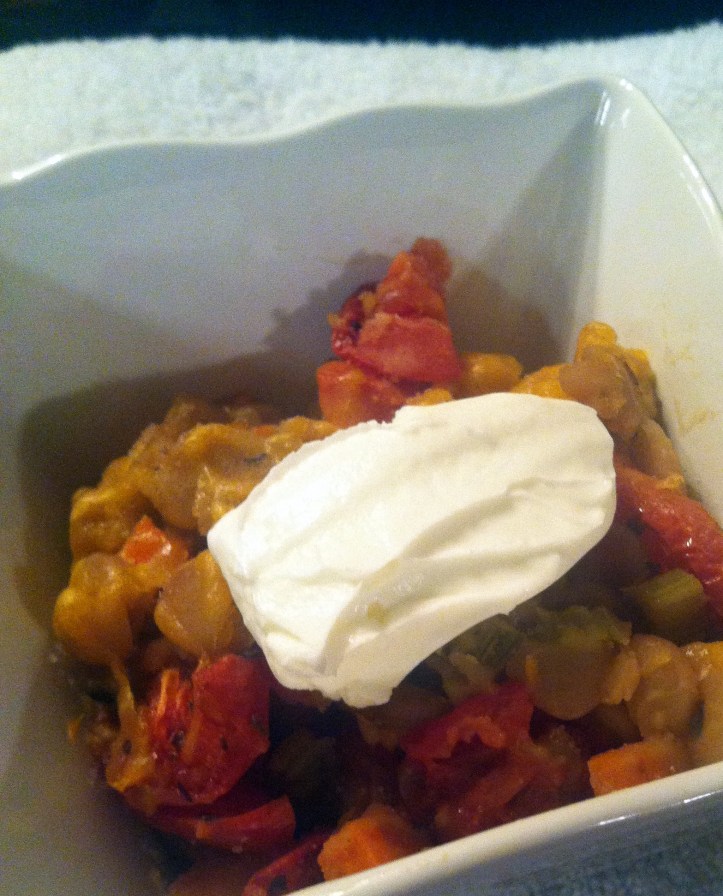 I like my pizza beans topped with a teaspoon of light sour cream. I love the contrast of the tangy-sweet sour cream with the savory beans. Jared doesn’t do this, because he doesn’t use sour cream on his pizza, so he doesn’t think he should on his pizza beans, either. 😉 Cute kid.