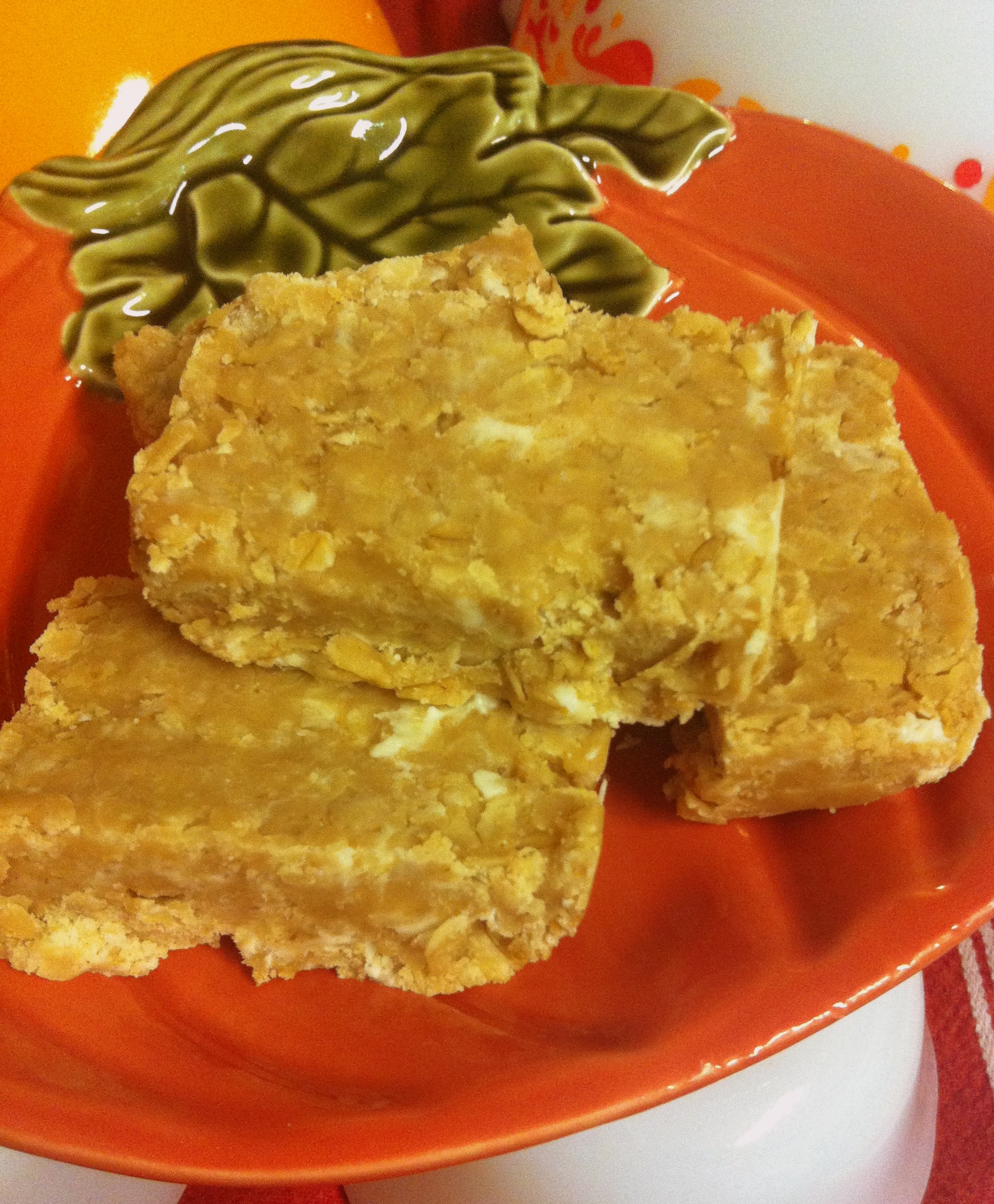 4. Drop by spoonfuls onto waxed paper or pour all at once into greased 8×8 pan  (ed. note: I used a 9×9 and they were still quite thick).   Allow to cool completely before serving.