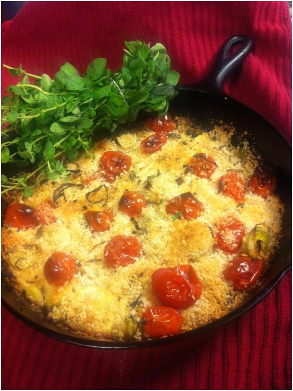 Place skillet in a 425 degree oven until all looks caramelized (tomatoes will burst, etc., when it’s ready)