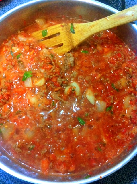 I added that to some meat I had already browned with onions and garlic. Then I seasoned it, and at the end of the cooking time, it was truly flavorful and we enjoyed eating it ladled over the tender angel hair pasta.