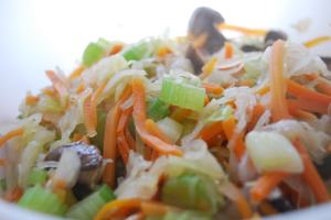Next, she’d open a big can of La Choy Chinese vegetables and a can of water chestnuts. She’d have us all help her chop fresh vegetables: button mushrooms, green onions, cabbage. She’d saute them and then add the canned veggies to it, followed by the meat. She’d cook this mixture together for awhile, flavoring it with soy sauce, and then finally, we’d eat.
