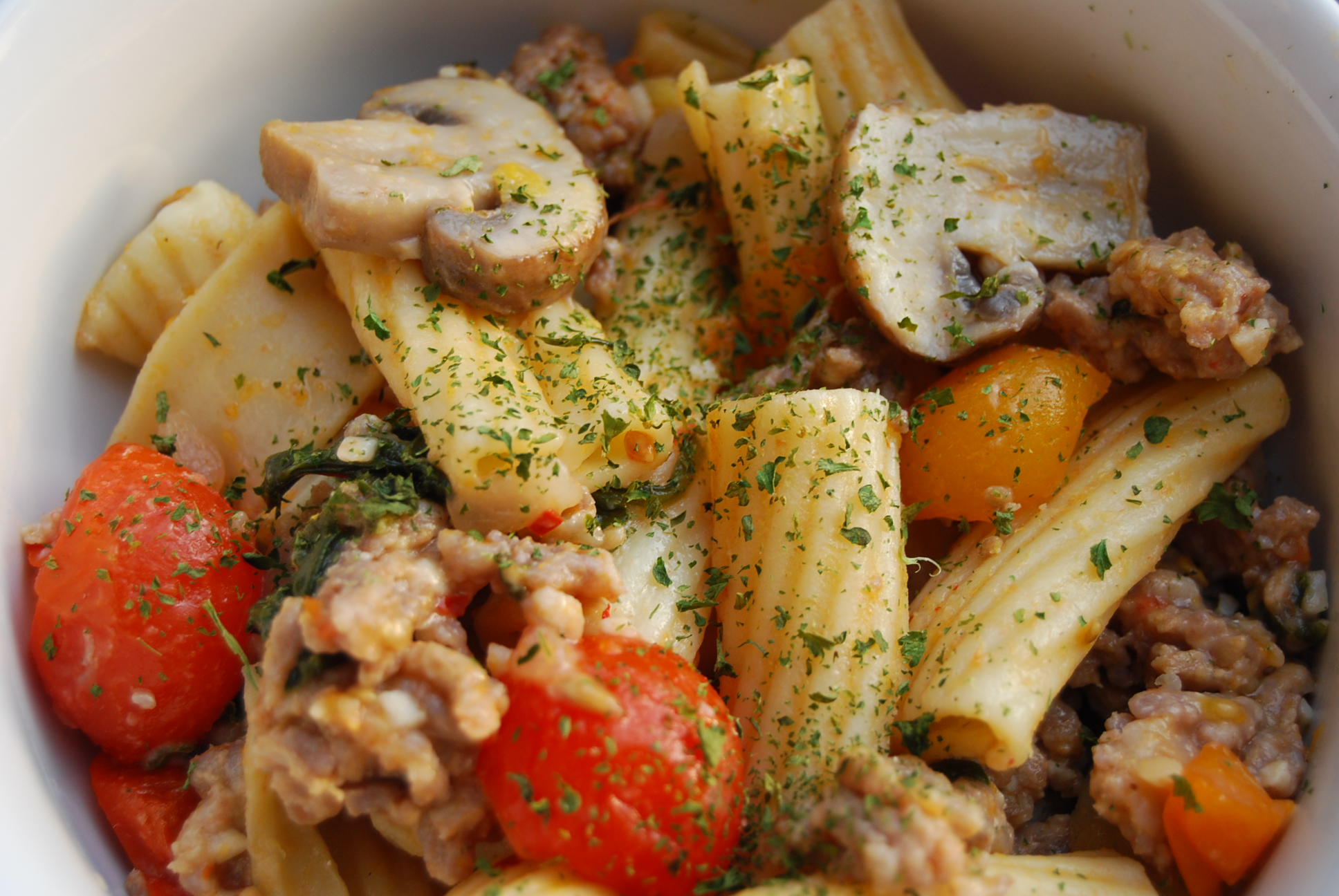 Spicy rigatoni with Italian sausage and vegetables