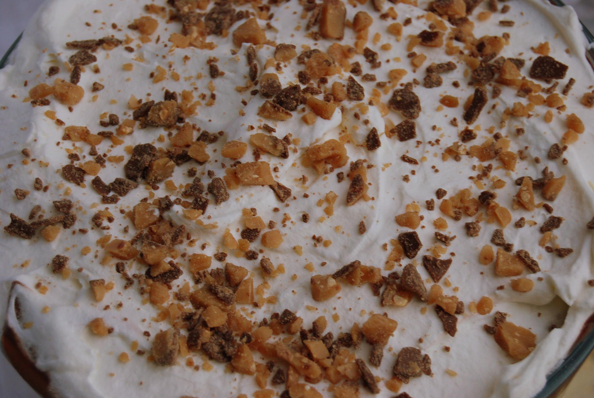 Finish the top with whipped cream, and sprinkle with Heath chips.
