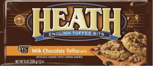 I purchased a bag of milk chocolate Heath bar bits. These are available on your store’s baking aisle alongside the bags of chocolate chips, and they come with or without chocolate. I always choose with! These are a great time-saver; twelve years ago they weren’t available so we bought individual Heath candy bars and broke them up inside a kitchen towel by banging them with a knife handle or a small hammer.