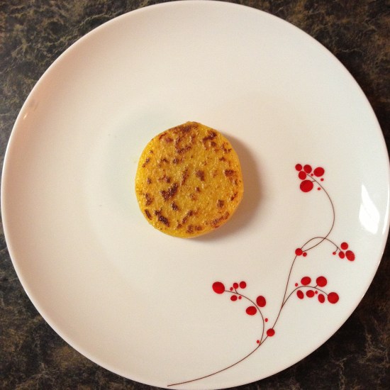 Drop in a handful of fresh mozzarella cubes, if you have some handy. Slice the polenta and slide the veggies over to one side of the pan, and place the slices on the bottom of the pan to heat, turning at least once. Sprinkle polenta with a bit of salt.