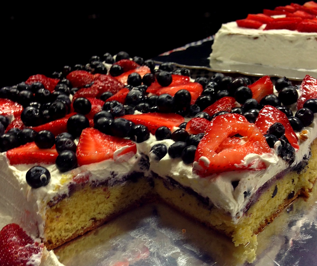 I baked a good pound cake (using my mama’s pound cake recipe, found here) having added blueberries to the batter, and then poked holes in it, drizzling it with the juice from the macerated berries. I used REAL whipped cream to “ice” the cake, and then topped it with even more berries. It was simply scrumptious!