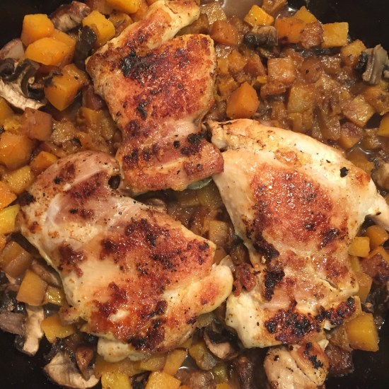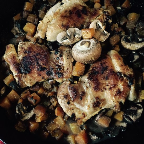 I hope you’ll try this simple skillet meal this week! It’s easy, as you’re letting the pan do all the work, especially if you buy pre-cubed squash. The produce section at Walmart always has it, so I imagine most stores do, especially in the fall. Great substitutes for butternut squash would be acorn or delicata squash, if you can’t get your hands on butternut or don’t like it.