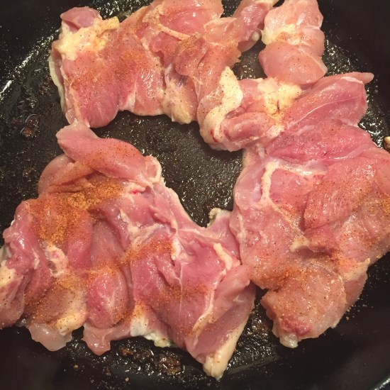 2. Season chicken thighs with salt and pepper (or use your favorite seasoning blend), and then place in oil in skillet.