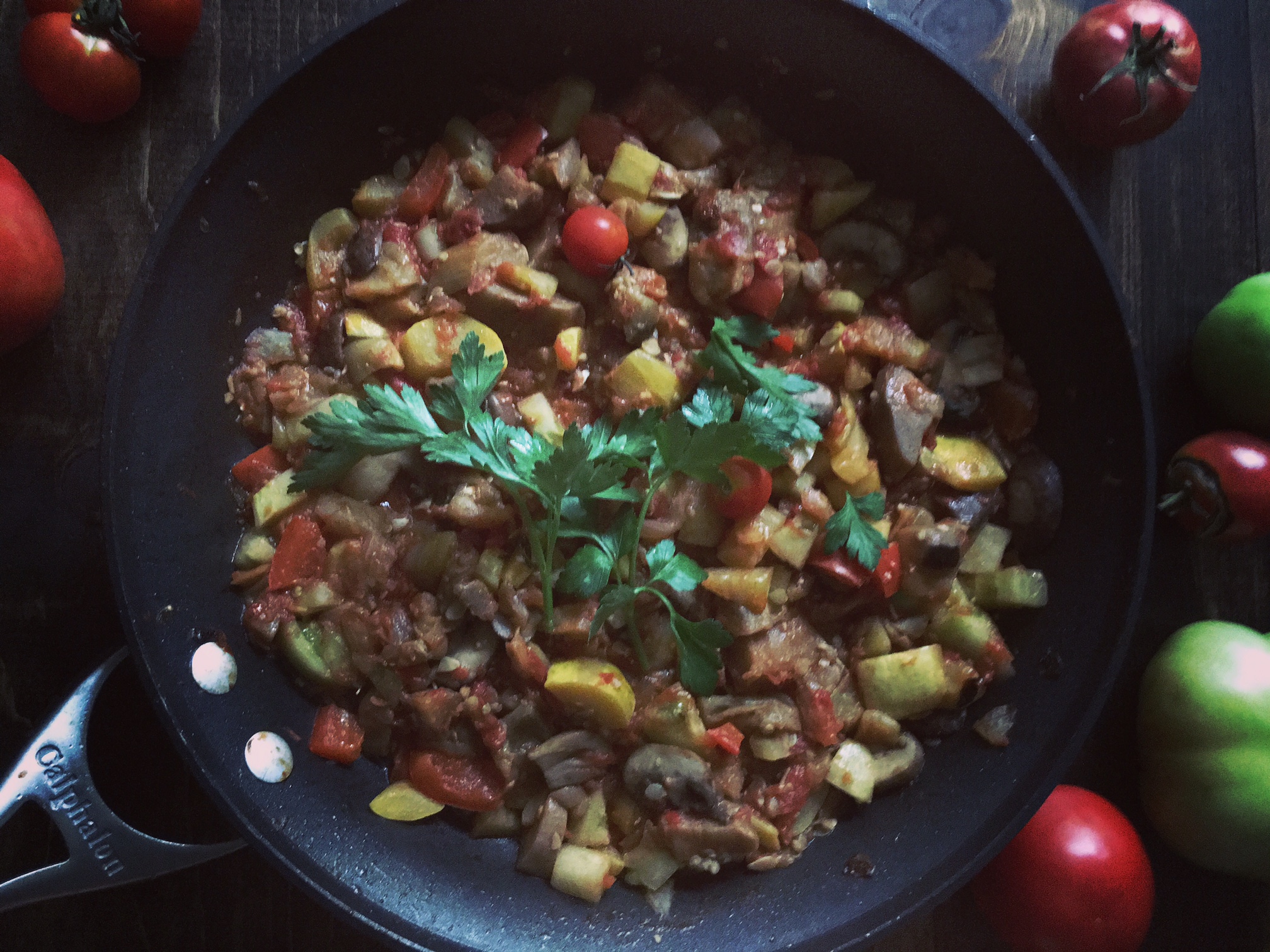 5. Drop in the eggplant, bell pepper, yellow squash, and mushrooms. Stir in, allowing to cook for ten minutes while you prepare tomatoes. Add another tablespoon oil if pan is too dry.