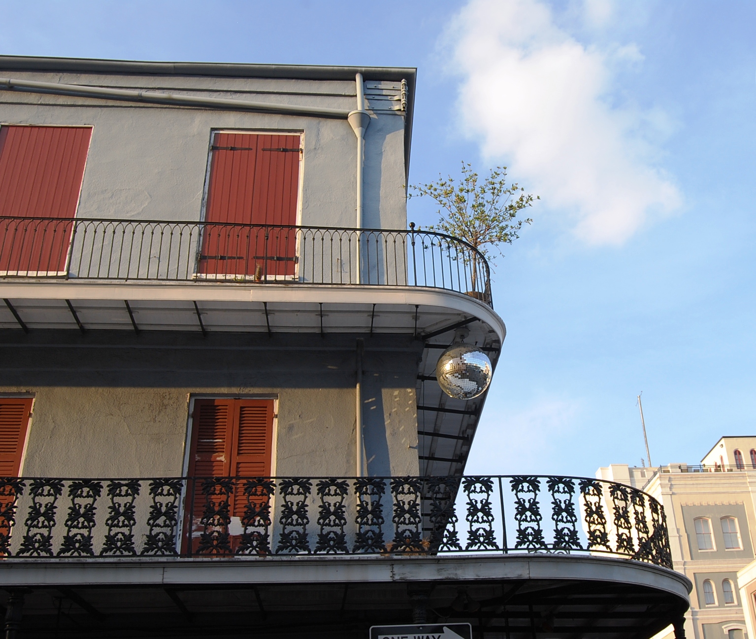 This was taken in the French Quarter in New Orleans in June.  I love that these people put a disco ball on their balcony. There were little light sparkles all over the street when we walked by.