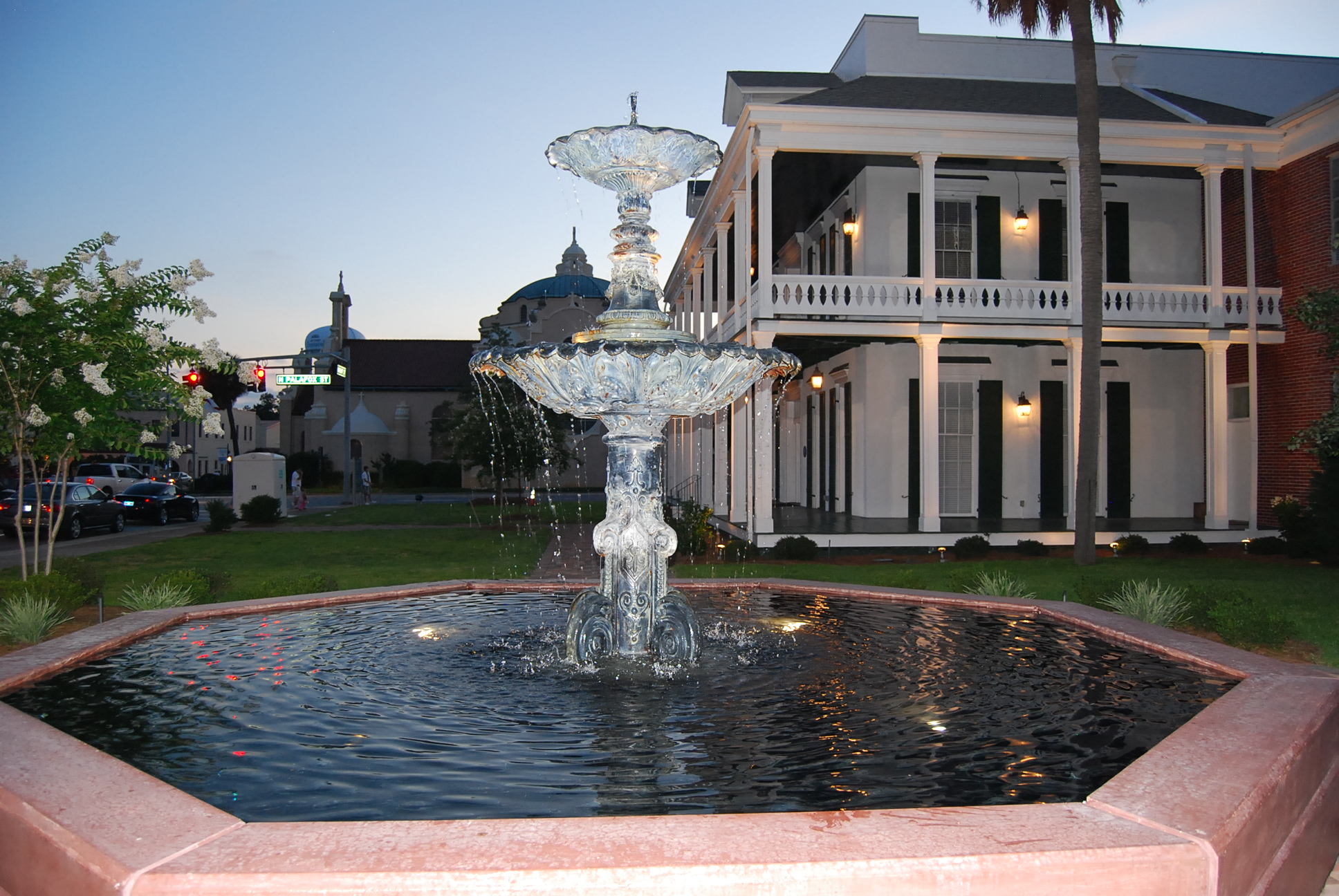 This photo is of First Baptist Church of Pensacola; taken on the evening of the Fiesta of Five Flags parade.