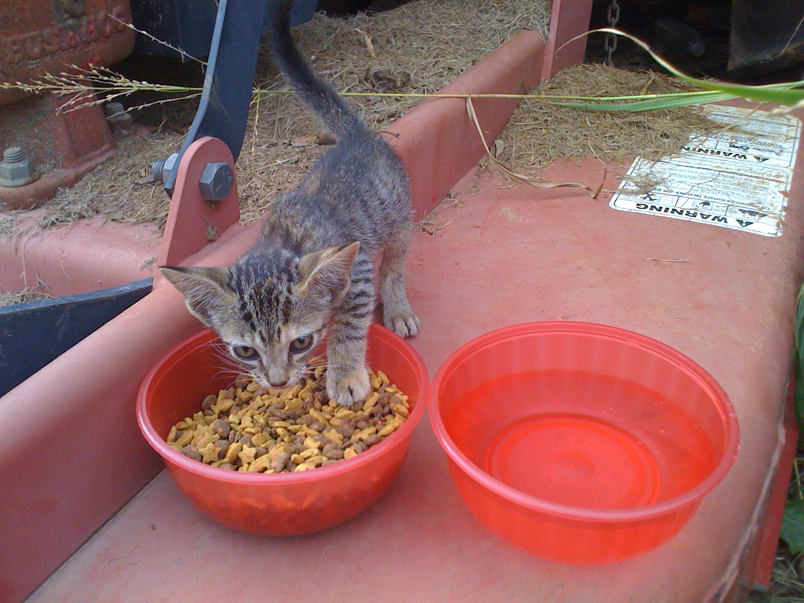 I dashed in the the house to grab some bowls to put food and water in. I brought the meal out and put it on top of the bush hog for her, as that seemed to be her favored implement. She greedily began eating the food. I was shocked; I thought she’d be thirstier than she was hungry, but no, she just wanted food. That little girl was starving. I could see the ribs poking out along the sides of her tiny little body.